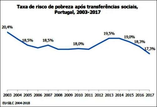 Em 2019, segundo um estudo recentemente publicado pela Fundação Francisco Manuel dos Santos, a taxa de risco de pobreza era de 17,2% no nosso país e 21,6% da população vivia em risco de pobreza e exclusão social.
