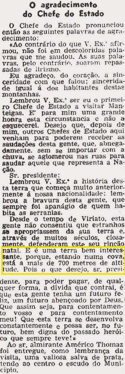 Quando ouvi ontem Cavaco Silva em Manteigas, saltou uma sensação de déjà vu, não porque soubesse que ele tinha lá passado a lua-de-mel (que raio de ideia!...), mas porque a minha memória recuou imediatamente 50 anos (tantos, será possível?!) e repescou um outro discurso de um igualmente inefável presidente da República, discurso esse que ficou célebre por uma daquelas pérolas tão características do raciocínio de Américo Tomás: «É uma terra bem interessante, porque estando numa cova está a mais de 700 metros de altitude.»