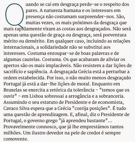 «Qualquer benefício obtido pelo Governo grego na situação actual de estrangulamento financeiro em que vive terá o efeito de uma bofetada em Passos Coelho e Paulo Portas. Pois que significará duas coisas: que não estamos condenados ao TINA (“There Is No Alternative”), e que vale mais não abdicar de ser um parceiro europeu, com voz própria e ainda que desprezada, do que ser um mero vassalo da vontade e interesses alemães, ajoelhando aos pés de Schäuble, como fez Vítor Gaspar, prometendo-lhe obediência eterna em troca de uma “atençãozinha” (tão ao nosso jeito e tradição).