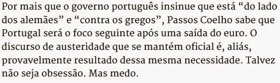 «Entre o programa económico do PS e a reforçada coligação do PSD e CDS há, também, um traço comum: ambos são filhos do Tratado Orçamental da UE. Mas, até ver, a sociedade portuguesa ainda não transformou a sua crescente pobreza e desintegração social numa recusa do regime e do arco político do poder. Há um consenso falso e uma coesão social semelhante a porcelana que, ao contrário do que pede Cavaco Silva, pode quebrar-se sonoramente a qualquer momento.