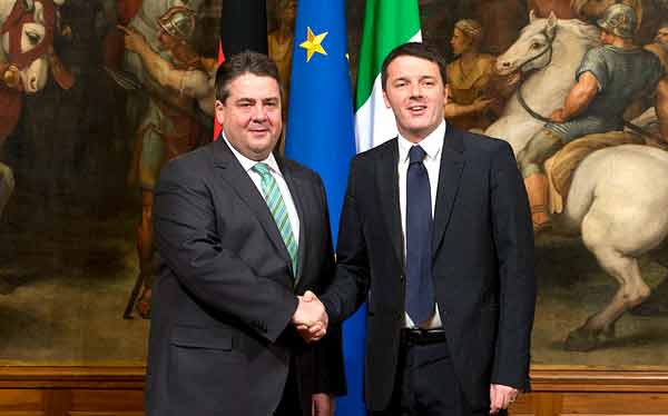 Sigmar Gabriel, líder do SPD e vice-chanceler alemão, e Matteo Renzi, líder do PD e primeiro-ministro de Itália, distanciam-se de Atenas no momento crucial das negociações em Bruxelas