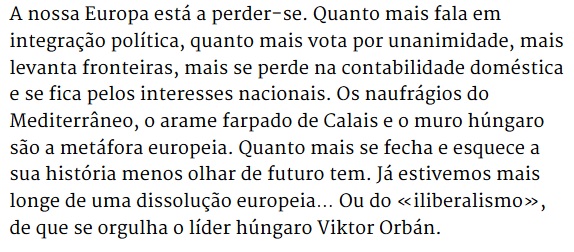 Muitos destes migrantes também estão ligados ao velho continente por séculos de passado colonial e até por isso a Europa tem responsabilidades para com eles. Não pode lavar as mãos como Pilatos. Mas a quem não consiga ver além dos seus próprios interesses, talvez seja útil pensar nas consequências de tanta cegueira. Os muros acabam por ser derrubados. Mais cedo ou mais tarde.»
