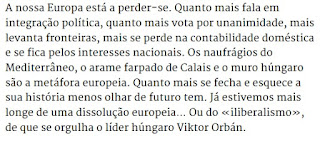 Uma das razões de sucesso desta imoralidade triunfante é que ela fornece uma panaceia para o ego ofendido de muita gente. Convencidos de que não podem mudar nada – não há alternativa –, o vizinho serve de bode expiatório. Num país (ou numa Europa) atingido por uma anomia profunda – resultado entre outras coisas do apagamento das diferenças históricas entre uma direita de interesses e uma esquerda que de há muito soçobrou aos mesmos interesses, e refiro-me aos socialistas cujo papel na castração da acção colectiva é enorme –, o que hoje se está a dividir, dificilmente se juntará. (...)
