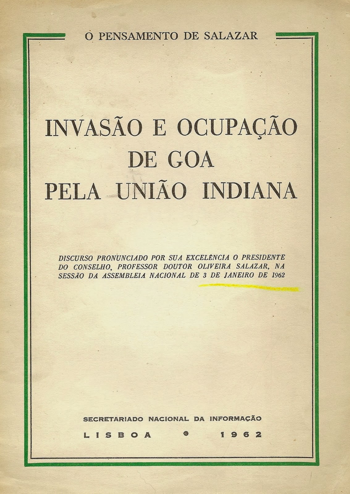 Os factos são conhecidos mas vale talvez a pena recordar o célebre discurso que Salazar fez na Assembleia Nacional, em 3 de Janeiro de 1962 (*). É um longo elogio (de 24 páginas A5...) ao «pequeno país» que manteve o seu território «com sacrifícios ingentes», ignorados e combatidos por quase todos e, antes de mais, pela ONU, desde sempre objecto de um ódio muito especial.
