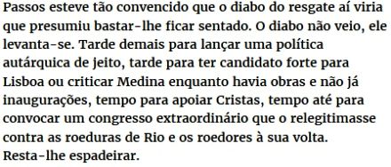 «Há alguns anos um dos mais populares grupos de rock da Galiza, os Resentidos, intitulou um disco seu como: "Vigo, capital Lisboa." Era uma ponte de afectos para lá das fronteiras, entre duas regiões que não se confundiam com dois países que viveram muito tempo de costas voltadas. Portugal fez-se por oposição a Castela, nunca o poderemos esquecer. Salvou-se da integração porque num momento crítico a coroa espanhola preferiu ficar com a Catalunha, nessa altura aliada dos franceses, em vez de Portugal, aliada dos ingleses. Vivemos sempre o dilema dessa divisão que nunca cicatrizou entre os povos de Espanha. Até porque o ADN imperial de Madrid nunca desapareceu: liofilizou-se. A independência nacional teve de se fazer sempre perante Castela. (…)