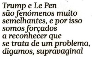 Le Pen é, como Trump, a face da mudança nas actuais eleições presidenciais e tem votos só por isso, pelo cansaço enorme do eleitorado em relação aos partidos tradicionais. Vai ser ela a ter o voto de protesto, que hoje a esquerda europeia parece incapaz de conseguir, pela combinação da decadência dos partidos socialistas, com o acantonamento da esquerda mais radical, embora esta tenha em França um candidato que sobrevive mais do que os socialistas à hecatombe da esquerda.»