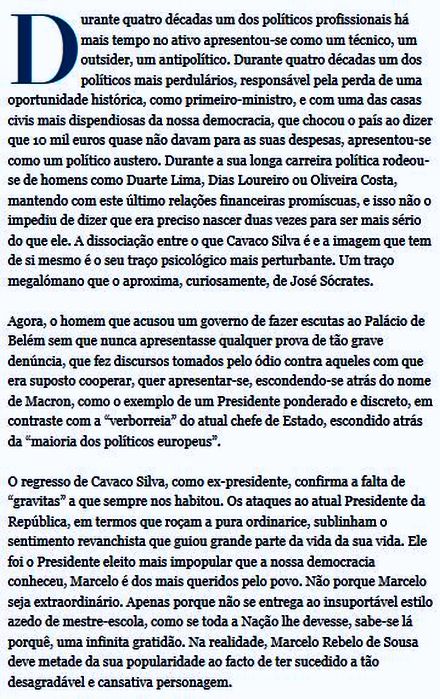 Por exemplo, quando disse, invocando Emmanuel Macron, que "em França não passa pela cabeça de ninguém um Presidente telefonar a um jornalista para lhe passar uma notícia", no fundo ele estava a atirar-se ao seu ex-assessor, Fernando Lima, que telefonou a um jornalista a inventar escutas telefónicas ao Presidente Cavaco e fez o trabalho tão mal feito que acabou por ser descoberto. Uma outra leitura, decorrente desta (aposto que Vasco Pulido Valente é da mesma opinião), é a de que um Presidente não deve telefonar a jornalistas, mas sim mandar terceiros ligar, para nunca sair chamuscado da coisa.