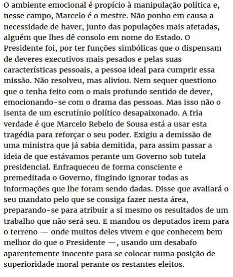 «Marques Mendes discutiu na SIC a frase de António Costa no debate da moção de censura: "Os votos do PS e do BE ainda não formam uma maioria neste Parlamento". O contexto permite perceber que o primeiro-ministro respondia a um tema colocado pelo Bloco sobre o qual não dava por certo que houvesse maioria no parlamento. Nenhuma novidade, isso já aconteceu com a intervenção pública nas terras sem dono, rejeitada por uma confluência entre o PCP e a direita. Não era portanto uma afirmação sobre o futuro mas sobre dificuldades do presente. Foi no entanto o bastante para suscitar emoção. Será que o PCP se vai por de fora? Será que o Bloco corre para o governo? Nem um nem outro, lamento desiludir os entusiastas.