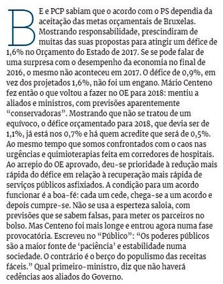 «O que se está a jogar por estes dias é a escolha do Governo entre dar passos concretos no caminho desenhado pelos seus acordos parlamentares à esquerda e a hipoteca desse caminho em favor de uma gestão orçamental espartana para agradar à União Europeia e às agências de rating. A escolha é do Governo, sublinho. Manter a meta de défice de 1% para o ano corrente selada no Orçamento de Estado ou, quatro meses depois desse acordo, mandá-lo às malvas e usar a folga criada pelo bom desempenho da economia para encantar Bruxelas é uma escolha da maior importância, reveladora das prioridades do Governo. É uma escolha entre a estabilidade dos acordos à esquerda e o desprezo por eles. E é uma escolha entre a qualificação de tudo aquilo (na saúde, nas escolas, nos transportes) cuja desqualificação tem sido justificada com a falta de dinheiro e o agravamento da degradação desses serviços públicos.