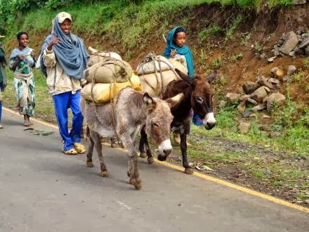 Desse país extensíssimo (o segundo de África), percorri apenas algumas centenas de quilómetros onde quase tudo é totalmente verde e fértil, com montes e vales bem cultivados (o celeiro etíope) e milhares de cabeças de gado que tornam o país praticamente autossuficiente em termos de alimentação. Mas falta tudo o resto e a pobreza é portanto extrema, as estradas e muitas outras infraestruturas são quase inexistentes ou muito rudimentares. Como mais do que rudimentares são os instrumentos usados na agricultura, numa terra onde «quem trabalha são as mulheres e os burros» – burros que são mesmo um ícone, tão grande é a sua quantidade, tão importantes as funções que exercem como meio de transporte de pessoas e de mercadorias.